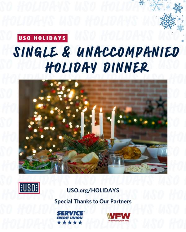 Stop by the USO center to enjoy a delicious homemade meal and gifts! Don’t miss out on the holidays just because you’re away from home and family! We are preparing a special celebration, just for our singles & unaccompanied community members with an incredible meal, gifts, and so much fun!