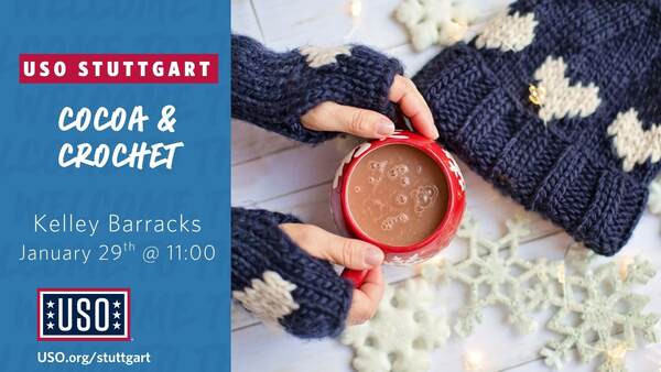 Beat the winter blues with a hot cocoa bar and all the toppings! Keep that cozy feeling going by picking out a handmade crocheted hat and discovering your hot cocoa name! *while supplies last! #theUSO #warmandcozy #huginamug