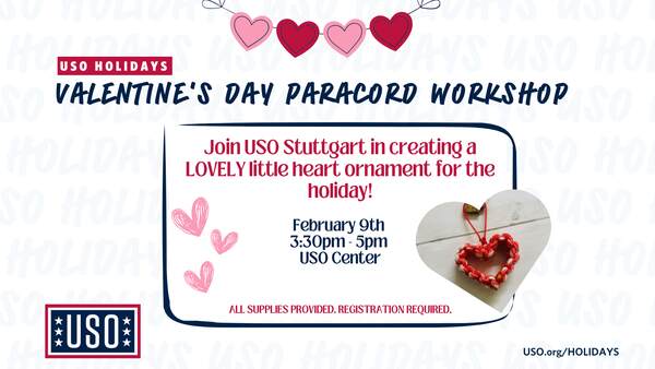 Tie it with love! ❤️ Join USO Stuttgart and volunteer Peter for a Valentine’s-themed paracord workshop at the center. Create a cute heart-shaped ornament, learn a new skill, and have some fun along the way. Supplies are provided. This free event requires registration—opens 1/26.