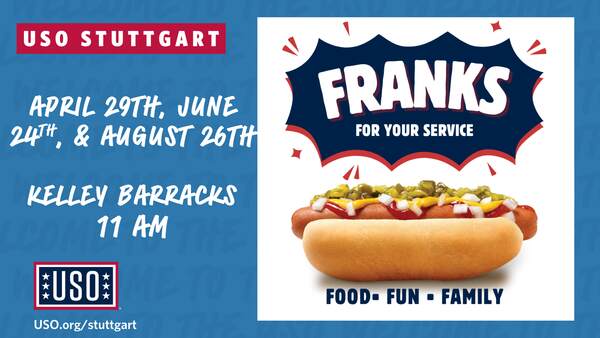 Join USO Stuttgart for a frankly delicious hot dog lunch loaded with all the fixins. We’ll be grillin’ up a storm to ketchup with you and help you relish your way out of those Wednesday blues. It’s bound to be bun-believable — don’t miss it! 😄