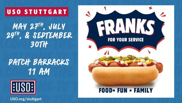 Join USO Stuttgart for a frankly delicious hot dog lunch loaded with all the fixins. We’ll be grillin’ up a storm to ketchup with you and help you relish your way out of those Wednesday blues. It’s bound to be bun-believable — don’t miss it! 😄