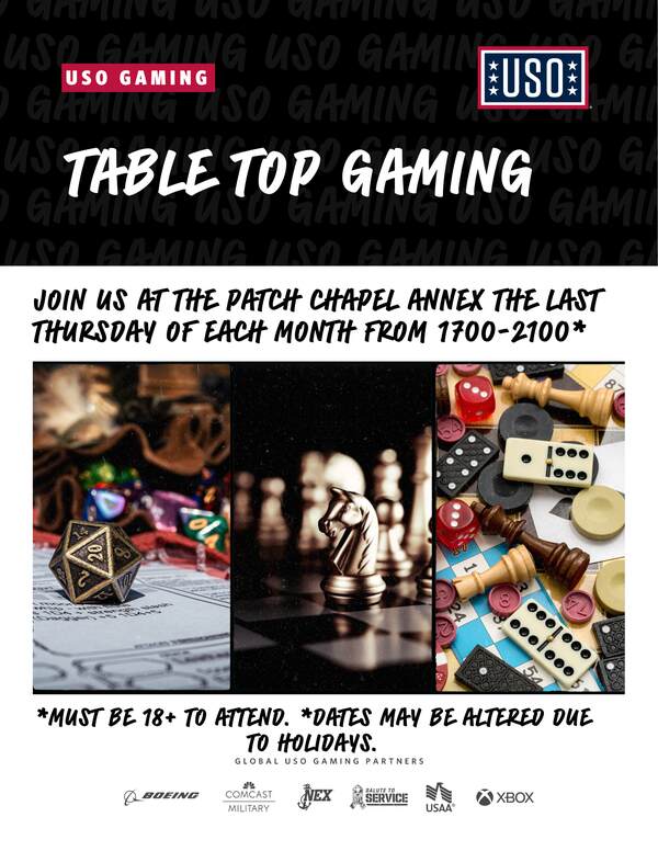 🎲 Roll the dice and seek an adventure! Join USO Stuttgart for tabletop gaming at the Patch Chapel Annex every last Thursday of the month, from 1700–2100! 🧙‍♂️⚔️ Whether you’re a seasoned DND or brand new to the dice, there’s a seat at the table for you. Whether it’s DND or your favorite game…jump on in!!! 📍 Patch Chapel Annex 🗓️ Last Thursday of every month Please check event schedule for alternative holiday dates. ⏰ 1700–2100 #theUSO #USOGaming #TabletopGaming #BoardGames #GameOn