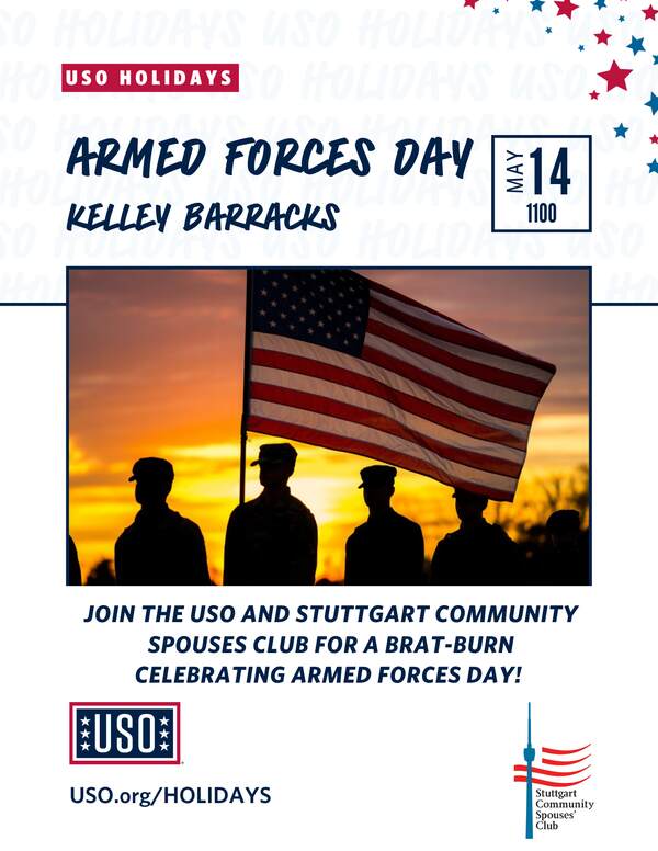 Are you an active member of the Armed Forces here in Stuttgart? Then join the USO and Stuttgart Community Spouses Club on Kelley Barracks as we celebrate YOU for Armed Forces Day! Please stop by for lunch on us! Thank you for all you do!