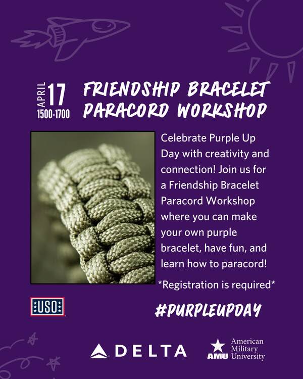 Join us for a fun-filled Friendship Bracelet Paracord Workshop where participants can create their very own purple bracelet, learn the basics of paracord, and celebrate Purple Up Day in a creative way. This hands-on activity is the perfect chance to knot around, try something new, and make a bracelet that’s both stylish and meaningful.