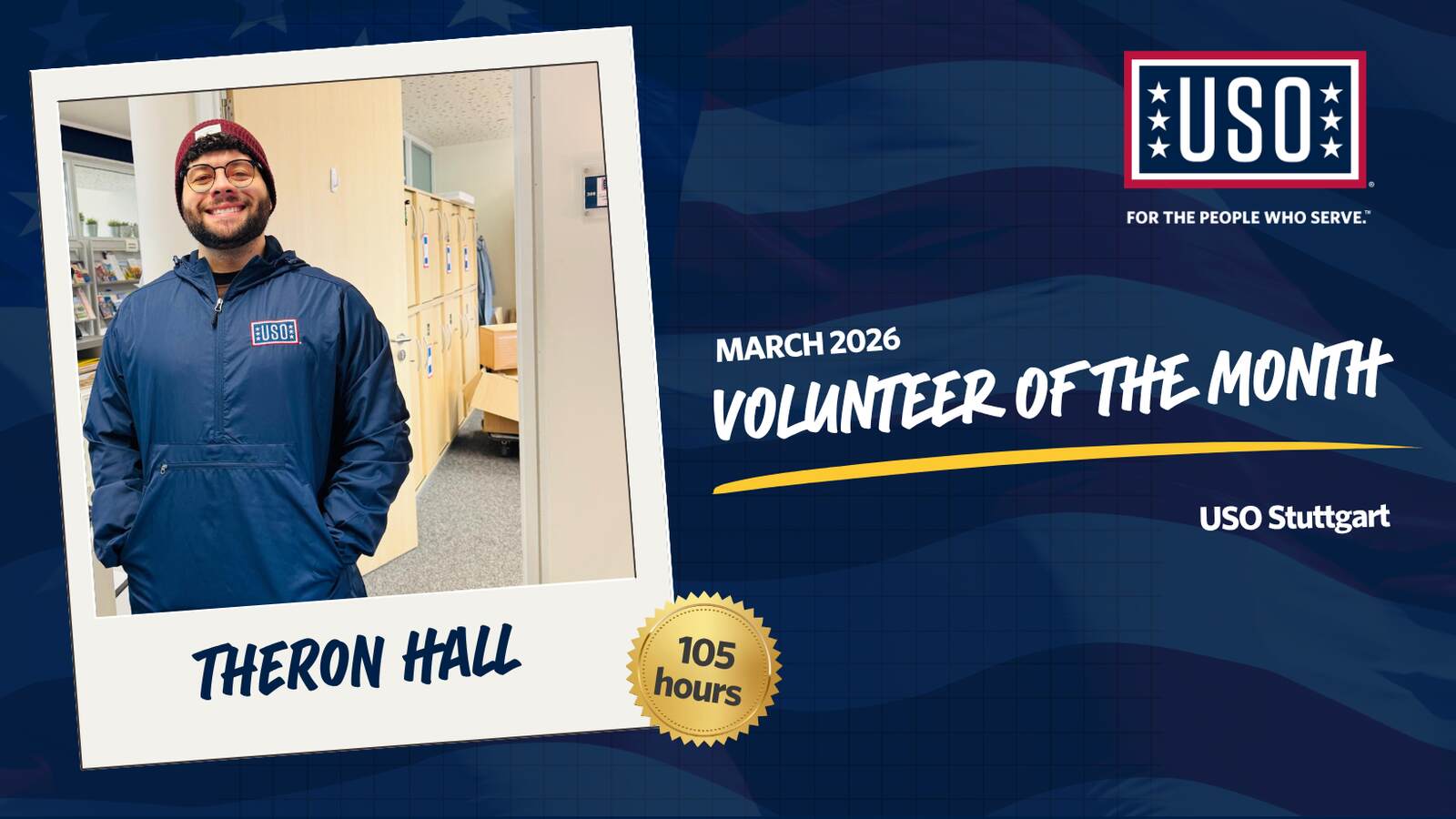 Since joining us in October 2025, Theron has already made a lasting impact on our team and community, contributing over 100 volunteer hours in such a short amount of time. While Theron is an Active-Duty Service Member, he still finds time to show up for USO Stuttgart with a servant’s heart and a genuine willingness to help wherever he’s needed.